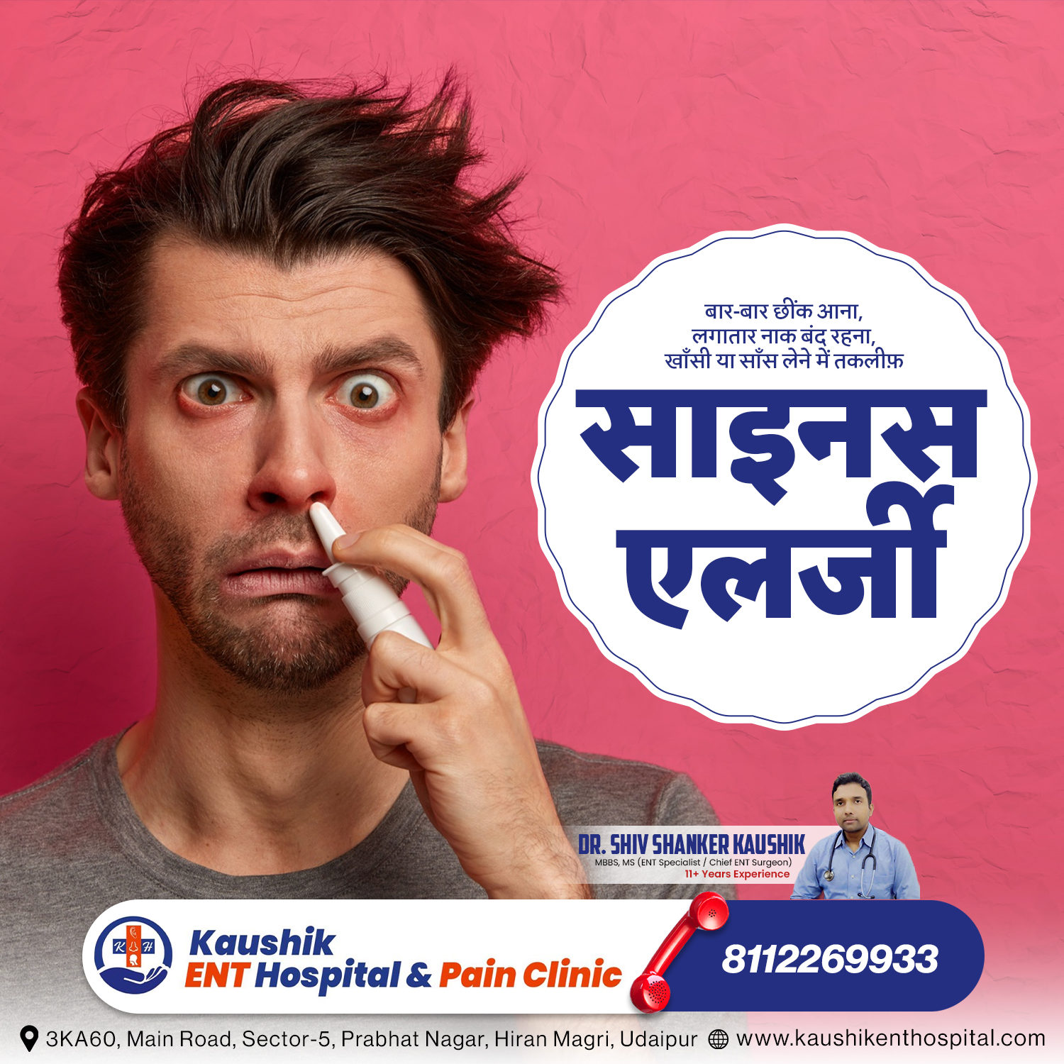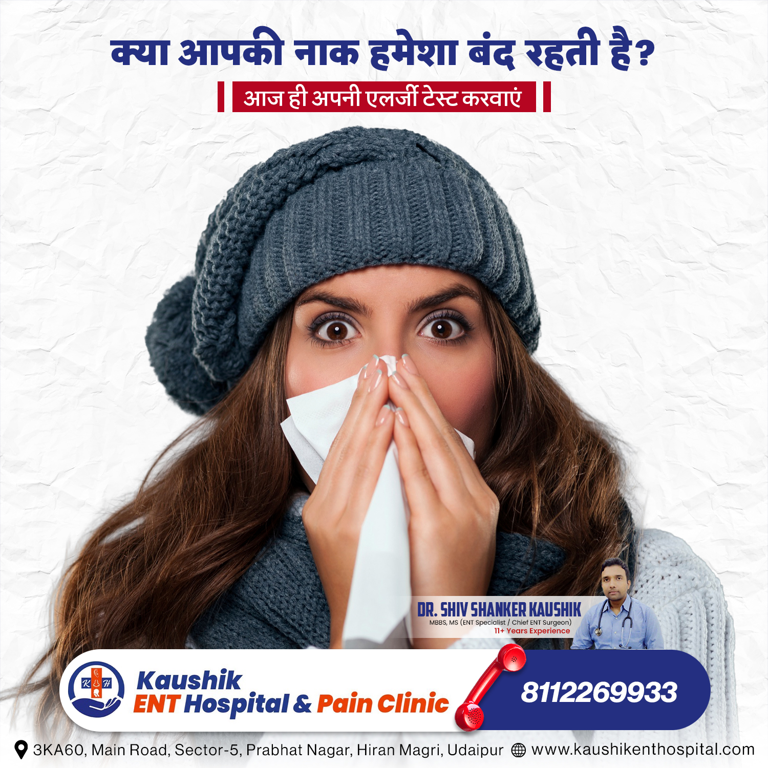 बार-बार नाक बहना, छींकें और सिर में भारीपन कोई साधारण सर्दी नहीं। Kaushik ENT Hospital, Udaipur में विशेषज्ञ उपचार उपलब्ध है।